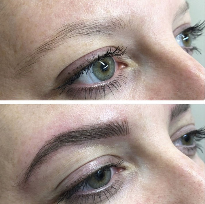 Microblading is a semi permanent tattoo technique in which a small handheld tool is used to add pigment to the eyebrow . Microblading differs from standard eyebrow tattooing because each hairstroke is created by hand using a blade which creates fine slices in the skin, whereas eyebrow tattoos are done with a machine and single needle. Microblading deposits pigment into the upper region of the dermis so it fades more rapidly than traditional tattooing techniques, which deposit pigment deeper. Yearly touch ups are recommended to maintain the brows, if yearly touch ups aren’t done the brows will fade away after 1-3 years.